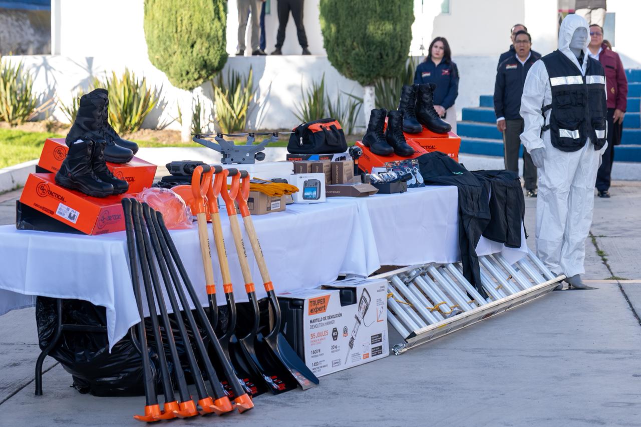 Previamente, el alcalde encabezó el pase de lista de la fuerza policial de Toluca y entregó equipo táctico y herramientas, entre ellas chalecos, botas, palas e impermeables, además de una cortadora de concreto y un dron para obtener imágenes y puntos de referencia de sus trabajos a la Célula de Búsqueda, gestionadas por el Instituto Municipal de la Mujer, con el objetivo de facilitar su labor y hacer más eficiente su actividad en beneficio de la población.