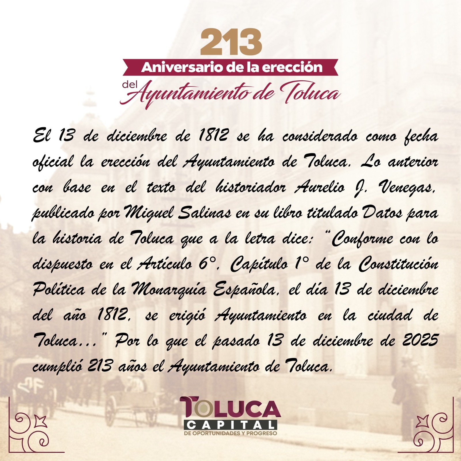 Es importante destacar que el 13 de diciembre de 1812 se ha considerado como la fecha oficial de la erección del primer Ayuntamiento, con base en el texto del historiador Aurelio Venegas, por lo que el pasado 13 de diciembre de 2025 se cumplieron 213 años.