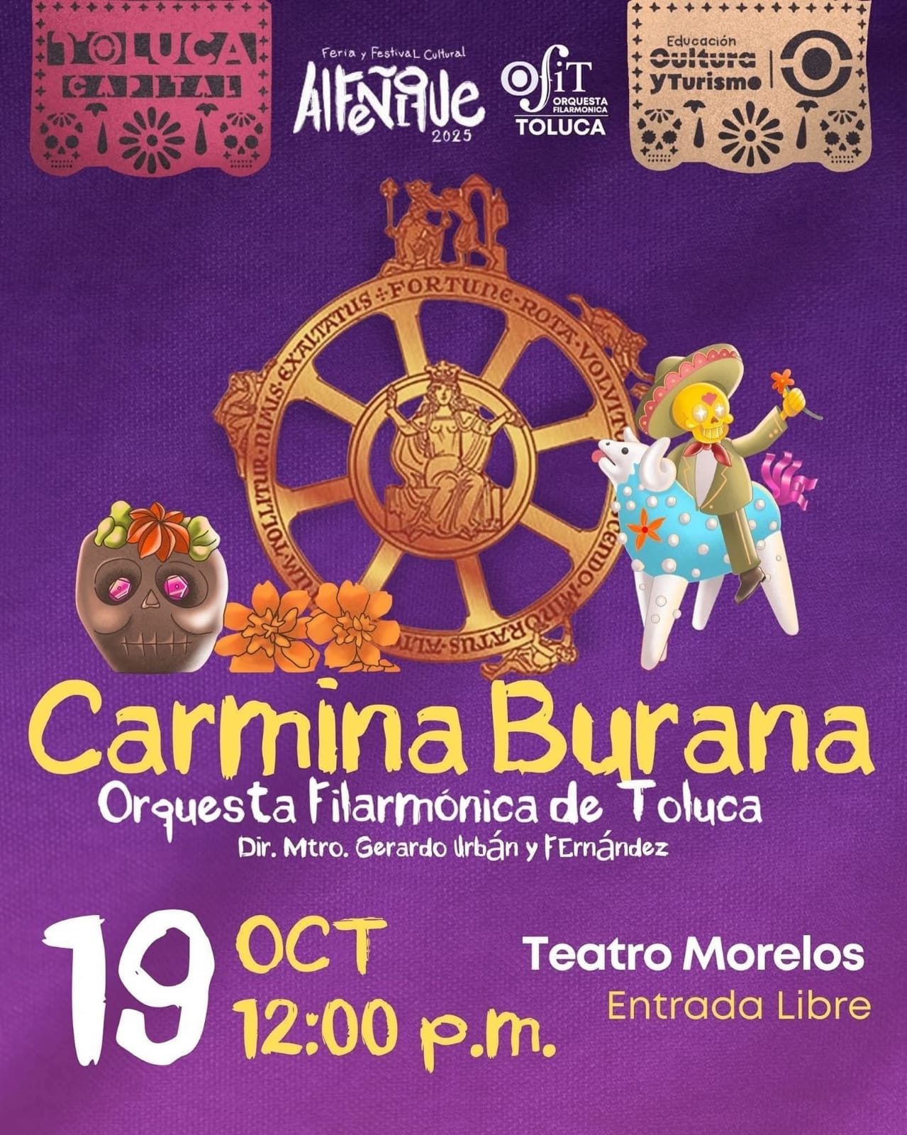 En otra parte de la ciudad, en del primer cuadro, la Orquesta Filarmónica de Toluca (OFiT) ofrecerá el concierto de Carmina Burana, a las 12:00 horas, en el Teatro Morelos, acompañados del Ensamble de Solistas del Ayuntamiento e integrantes de los Coros del Colegio Alemán, del Conservatorio Nacional de Música, Promúsica, Coral Metsi Dehu, el Juvenil e Infantil de Toluca.