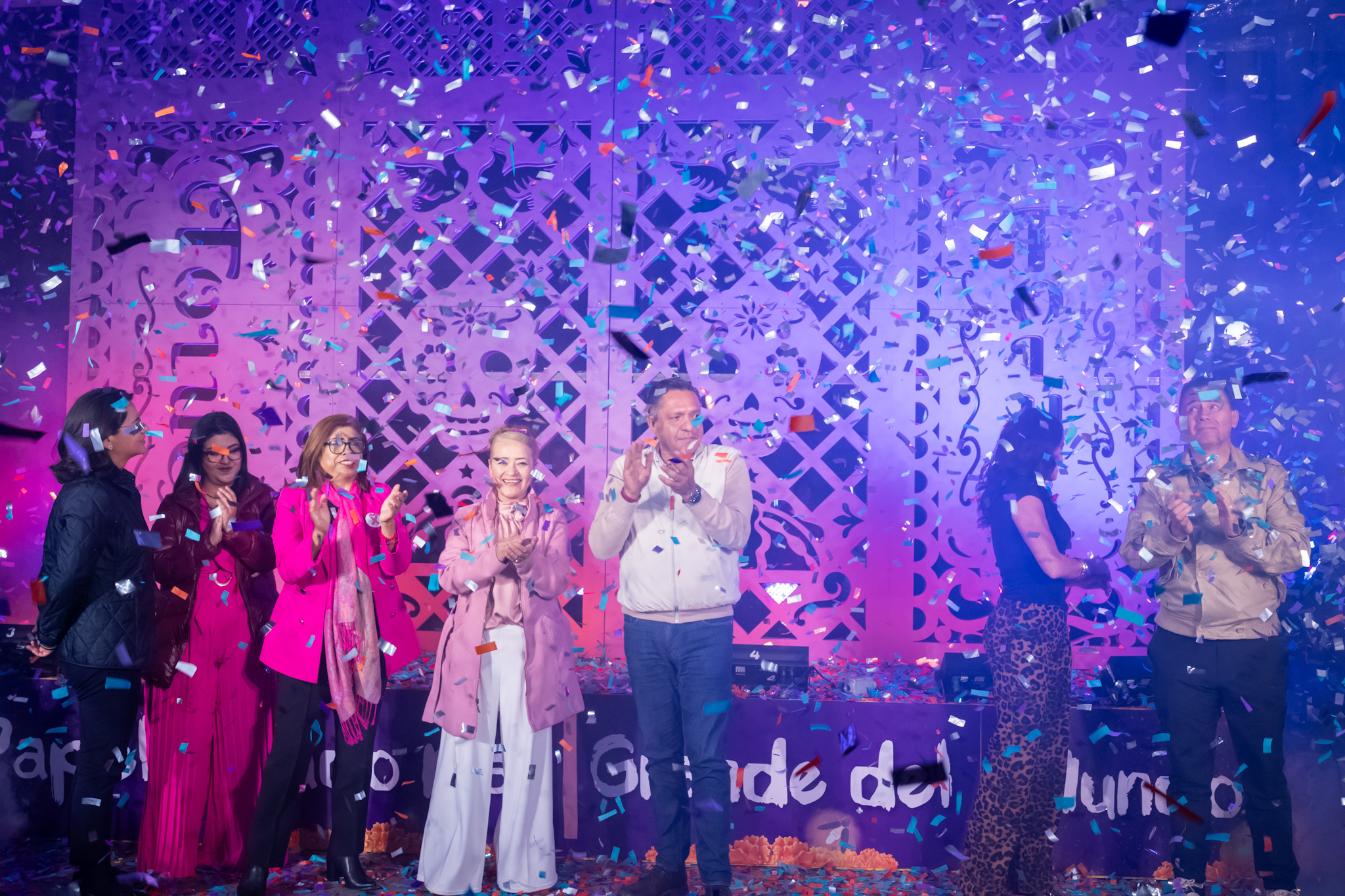 Toluca, Estado de México, 7 de octubre de 2025.- Como parte de las más de 800 actividades de la Feria y Festival del Alfeñique Toluca 2025, el Presidente Municipal Ricardo Moreno inauguró en Los Portales de Toluca el Papel Picado Más Grande del Mundo, una creación artesanal en tono morado que rinde homenaje a una de las tradiciones más representativas de México, el Día de Muertos.