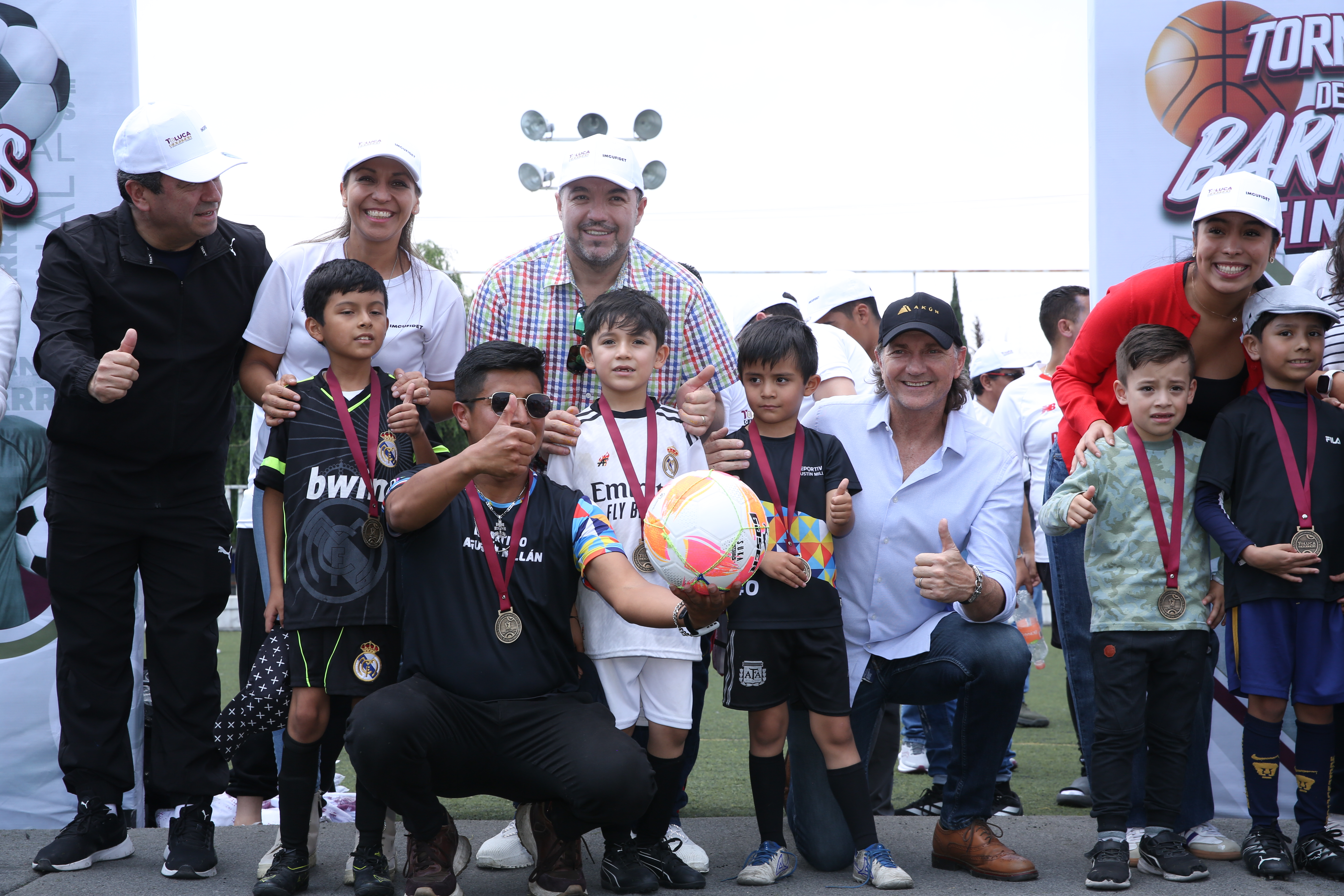 Toluca, Estado de México, 17 de mayo de 2025.- Más de 300 infantes disfrutaron del Torneo de Barrios, que durante cuatro meses promovió la actividad física, la sana convivencia y el desarrollo de talentos deportivos en futbol 7 y basquetbol, para después recibir sus premios de mano del icónico Hernán Cristante.
