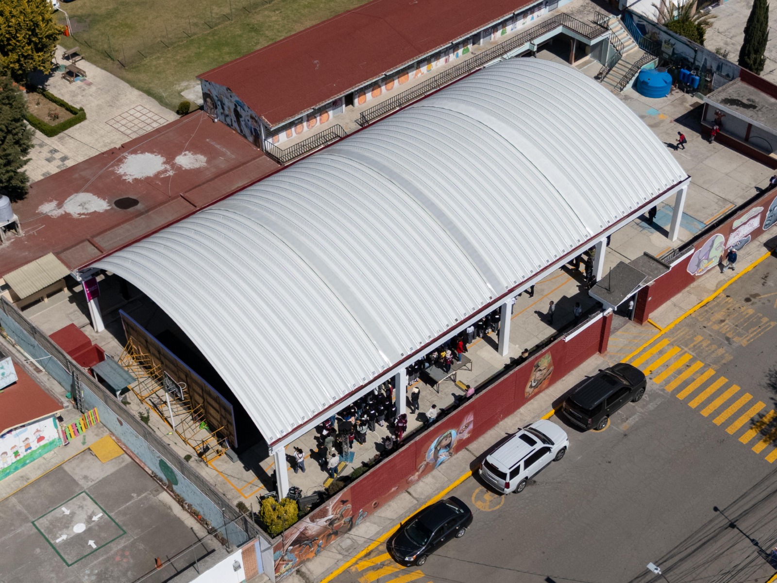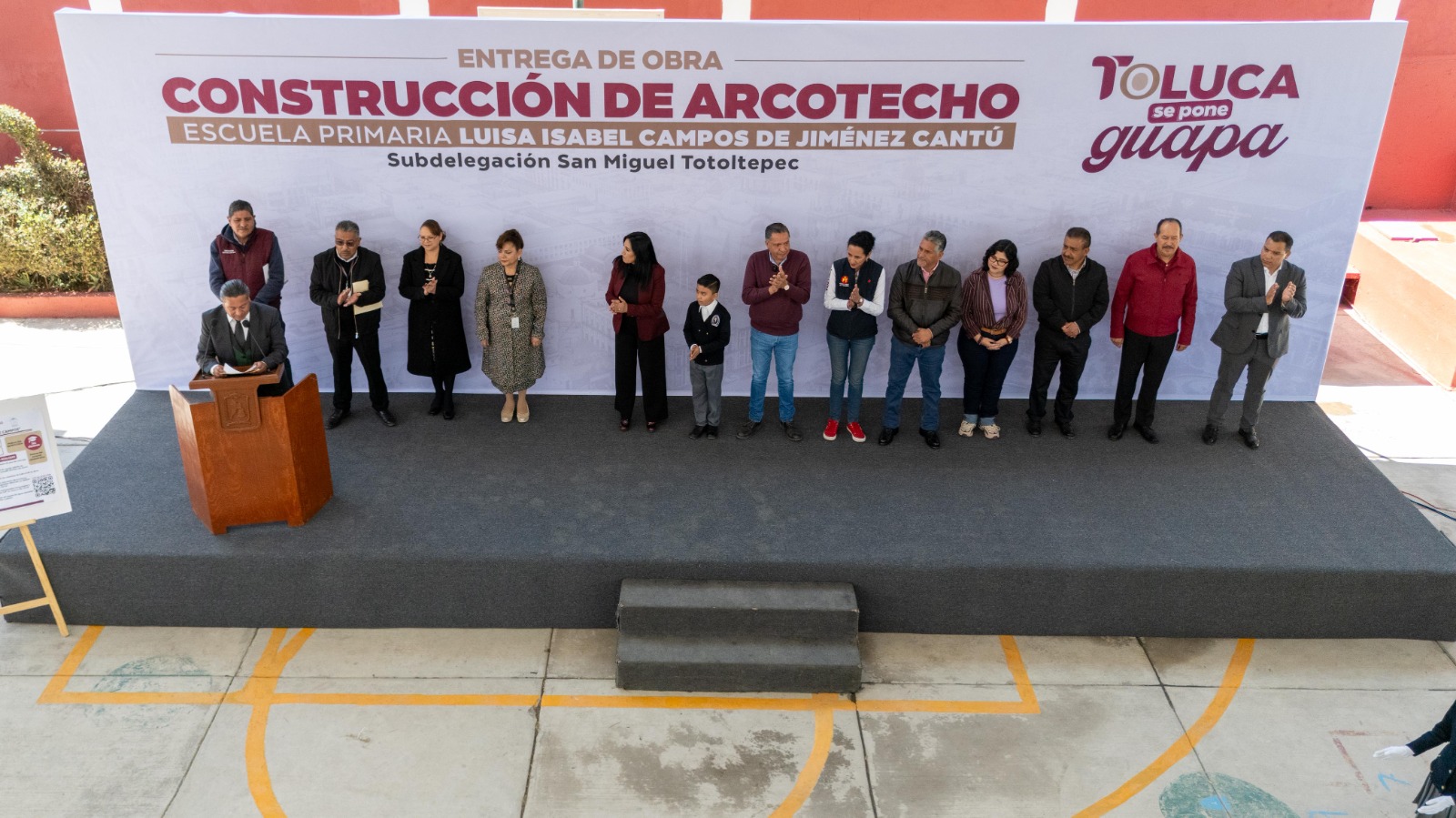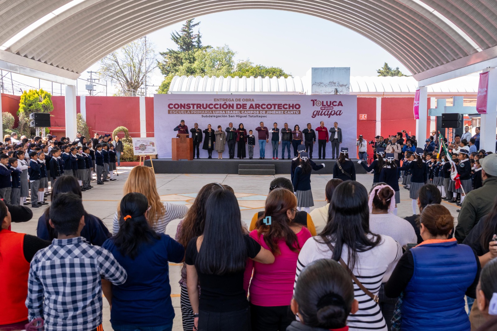 Toluca, Estado de México, 3 de febrero de 2026.- Para brindar mejores condiciones a las actividades que se realizan en la Escuela Primaria Luisa Isabel Campos de Jiménez Cantú, ubicada en la Subdelegación San Miguel Totoltepec, el Presidente Municipal de Toluca, Ricardo Moreno, realizó la entrega de un arcotecho de 527 metros cuadrados de superficie.