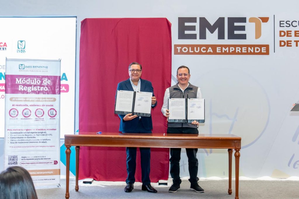 Toluca, Estado de México, 27 de noviembre de 2025.- Para garantizar que la población sin seguridad pueda acceder de manera gratuita y oportuna a servicios médicos de calidad, el Presidente Municipal, Ricardo Moreno y el titular de la Coordinación Estatal del IMSS Bienestar, Natán Enríquez Ríos, firmaron un convenio de colaboración con la finalidad de garantizar el derecho humano a la salud.