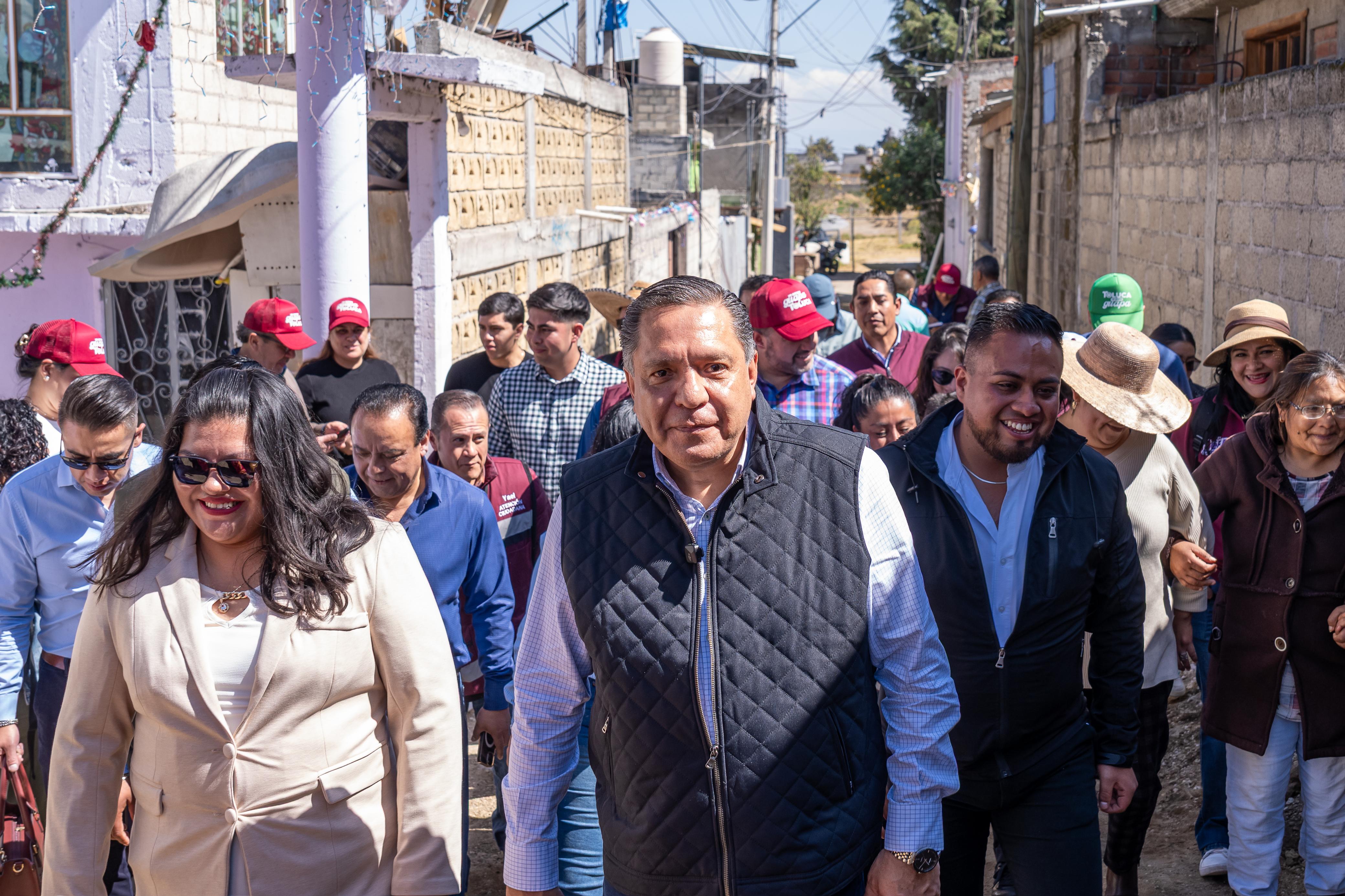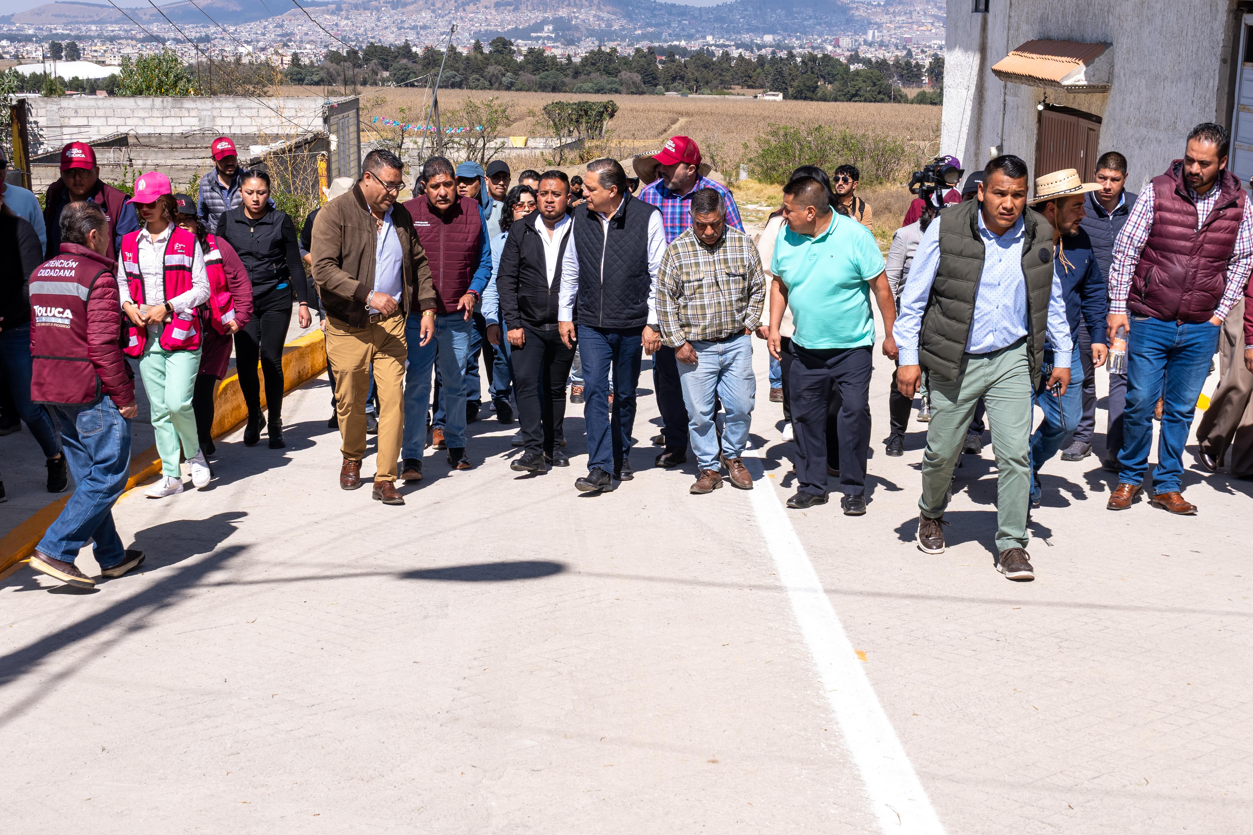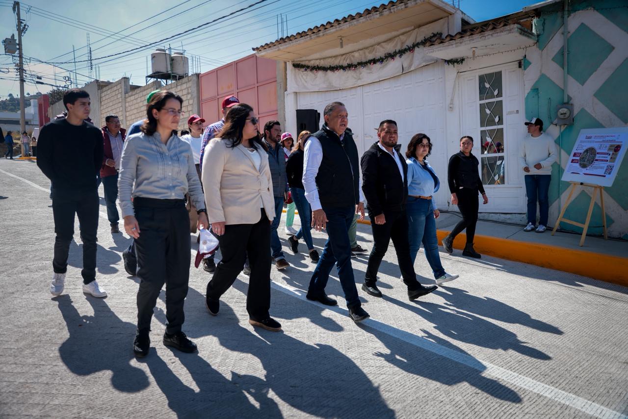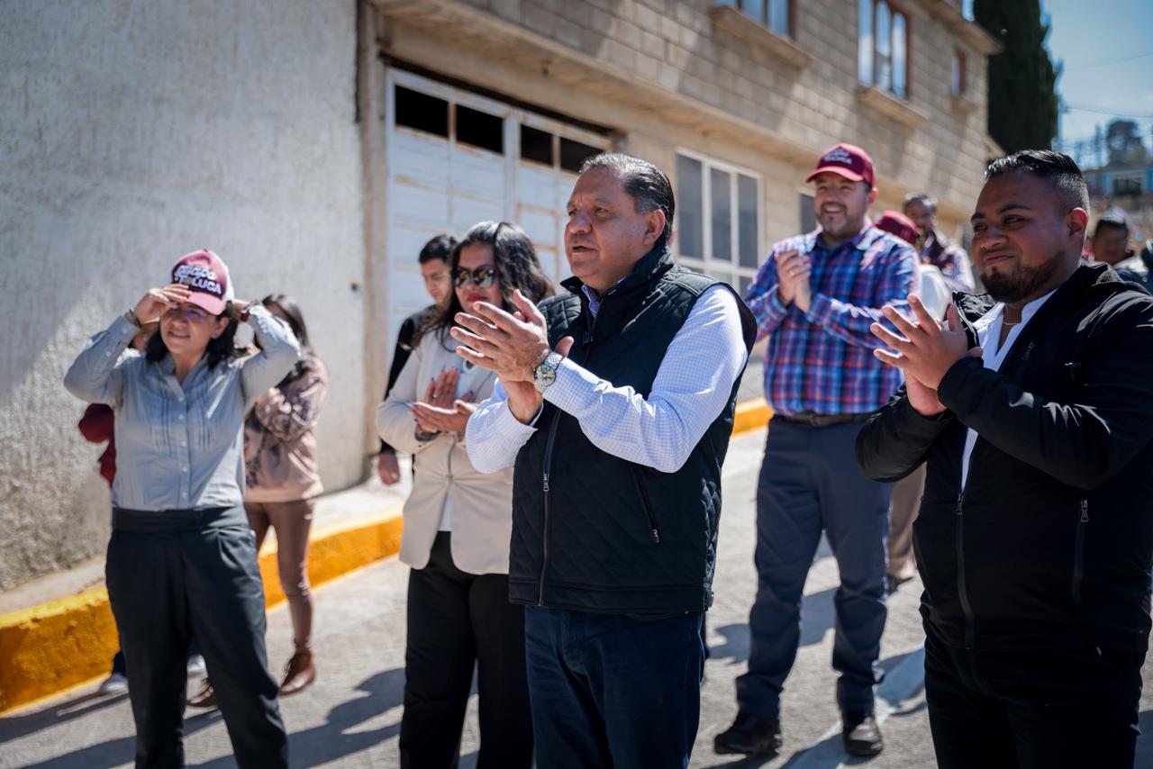 Toluca, Estado de México, 27 de enero de 2026.- El Presidente Municipal, Ricardo Moreno, reafirma su compromiso con los habitantes de Santiago Tlacotepec, con la entrega de la calle Los Pajaritos, obra realizada con concreto ecológico el cual permite la recarga de los mantos acuíferos, al tiempo que mejora la movilidad y conectividad de la zona.