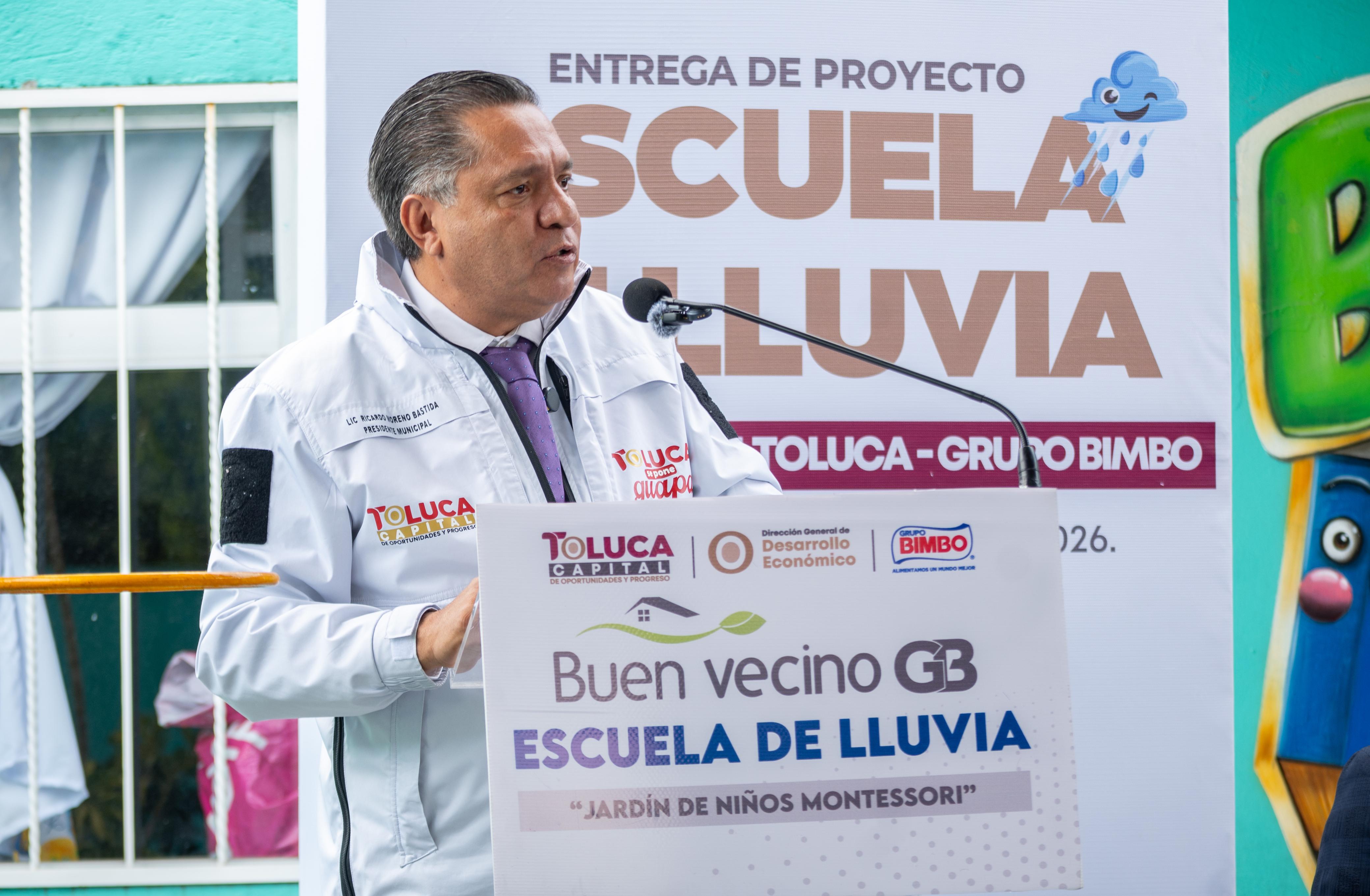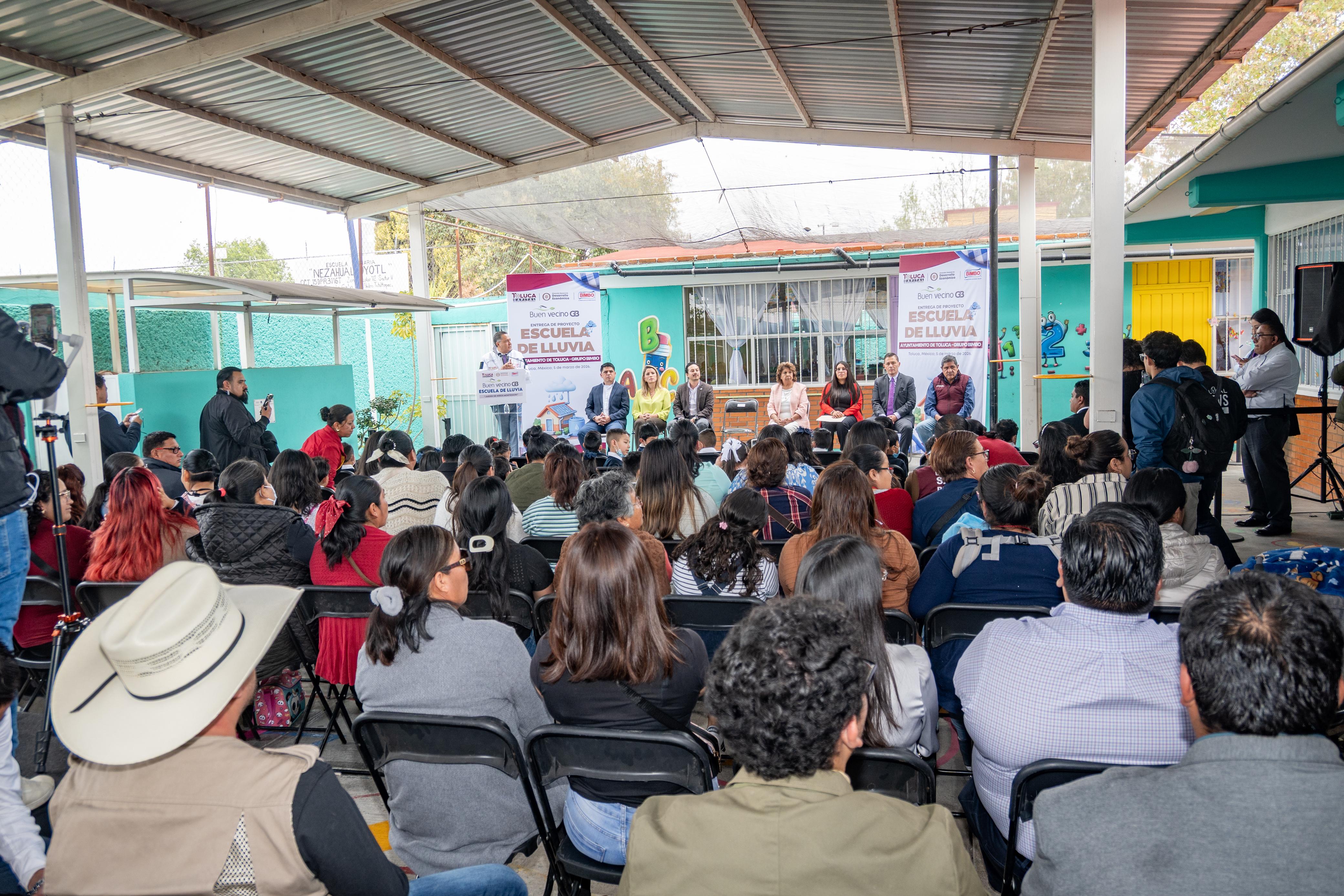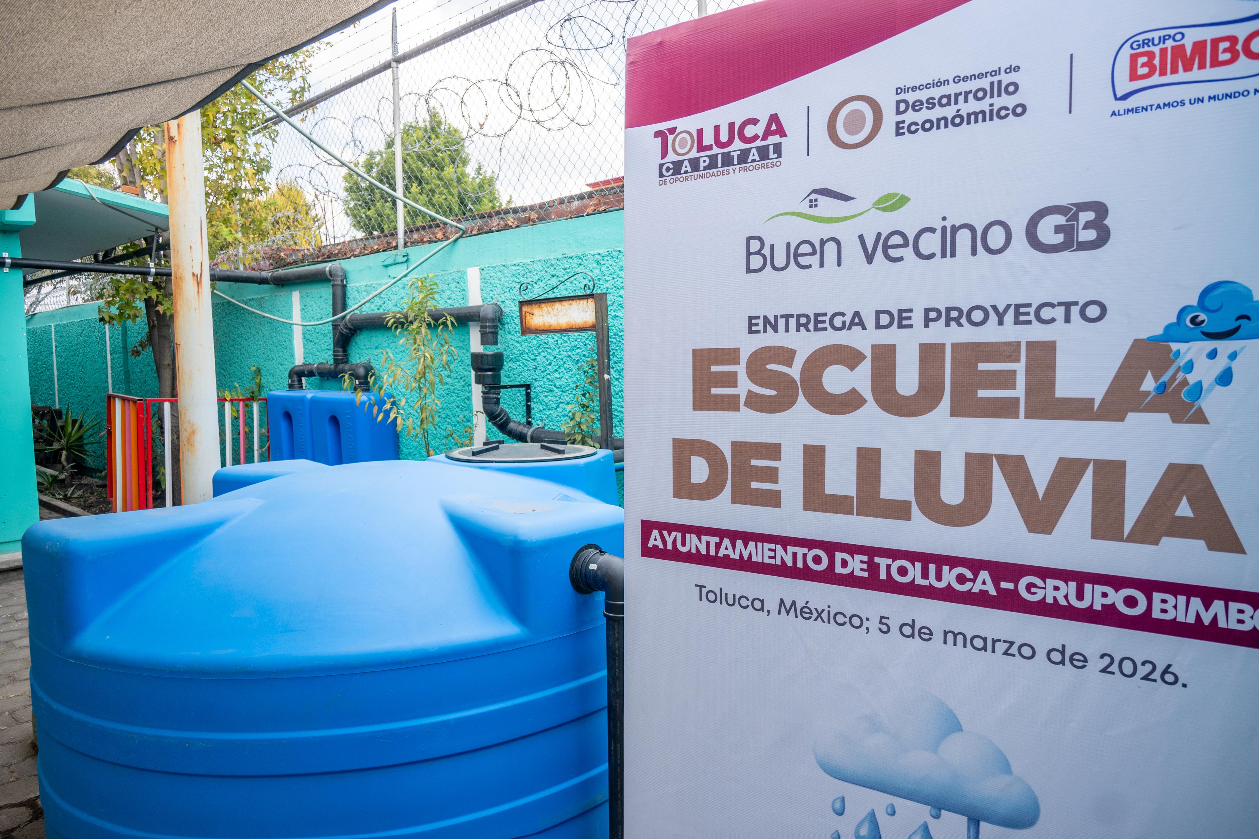 Toluca, Estado de México, 5 de marzo de 2026.- El alcalde Ricardo Moreno y Grupo Bimbo inauguraron como “Escuela de Lluvia” al Jardín de Niños María Montessori, de San Pedro Totoltepec, con lo que Toluca impulsa acciones concretas para enfrentar la escasez hídrica, fortalecer el uso responsable del agua y reducir la huella ambiental.