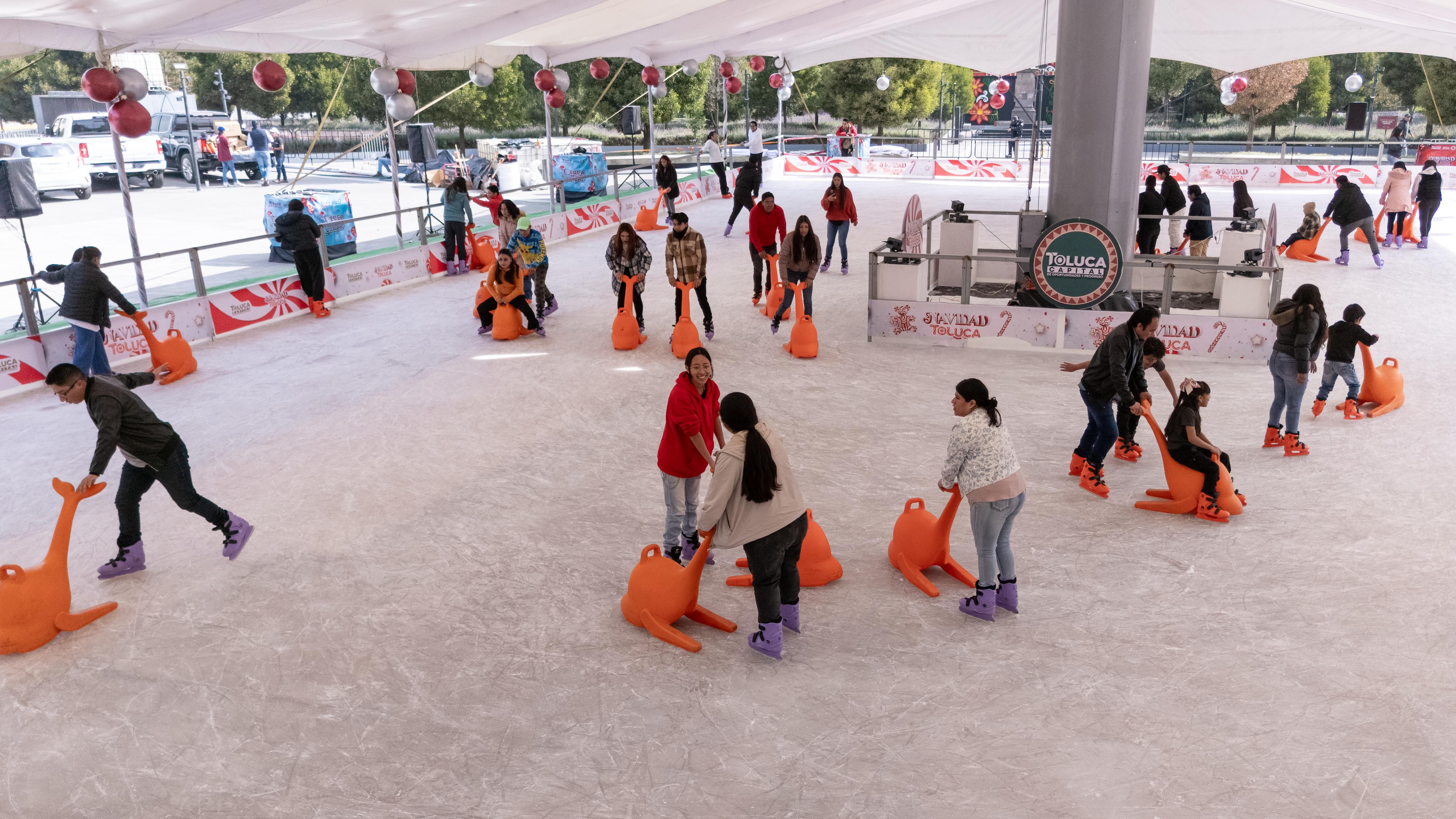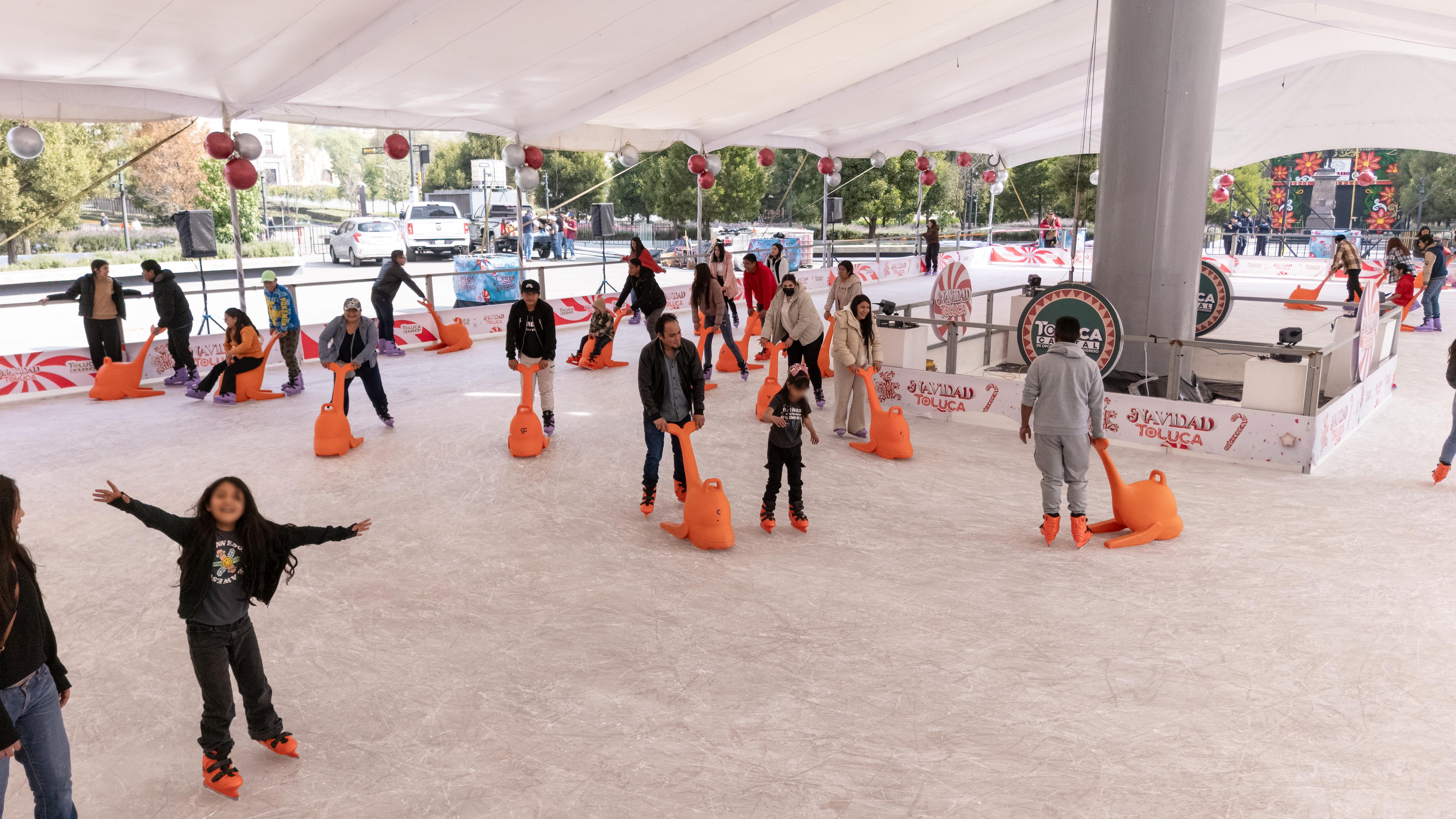 Toluca, Estado de México, 6 de diciembre de 2025.- Ochocientos metros cuadrados de diversión gratuita esperan a las familias toluqueñas en el corazón de la ciudad, con la pista de hielo instalada en la Plaza de los Mártires.