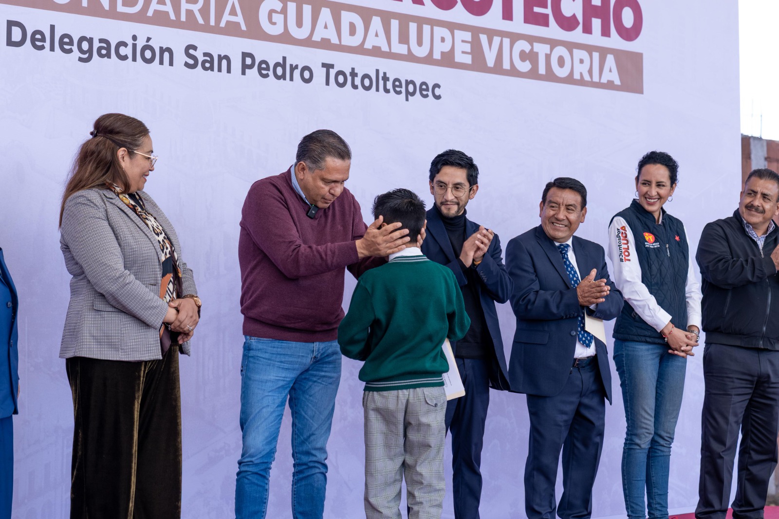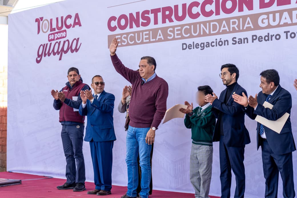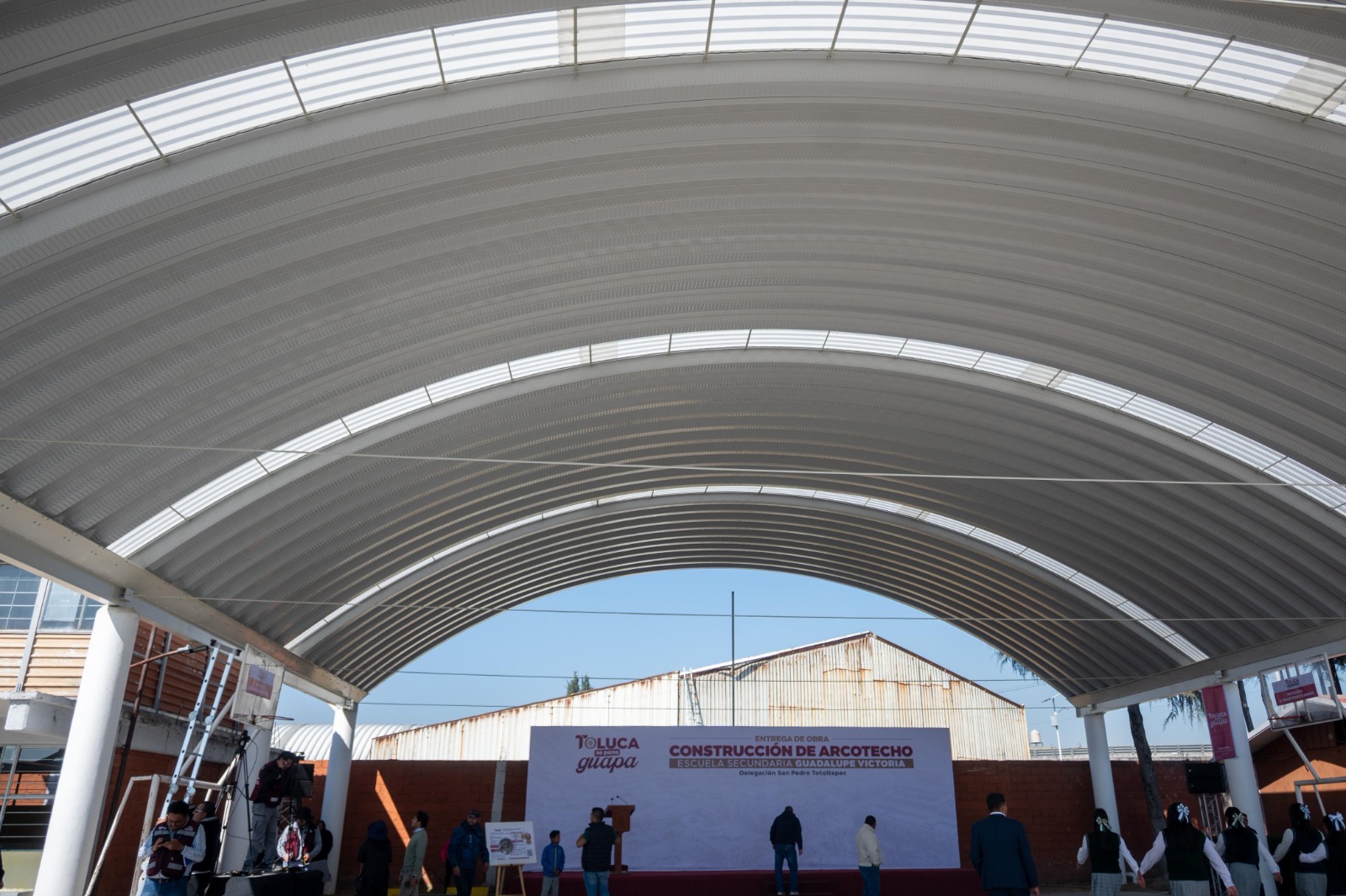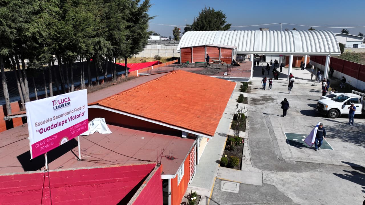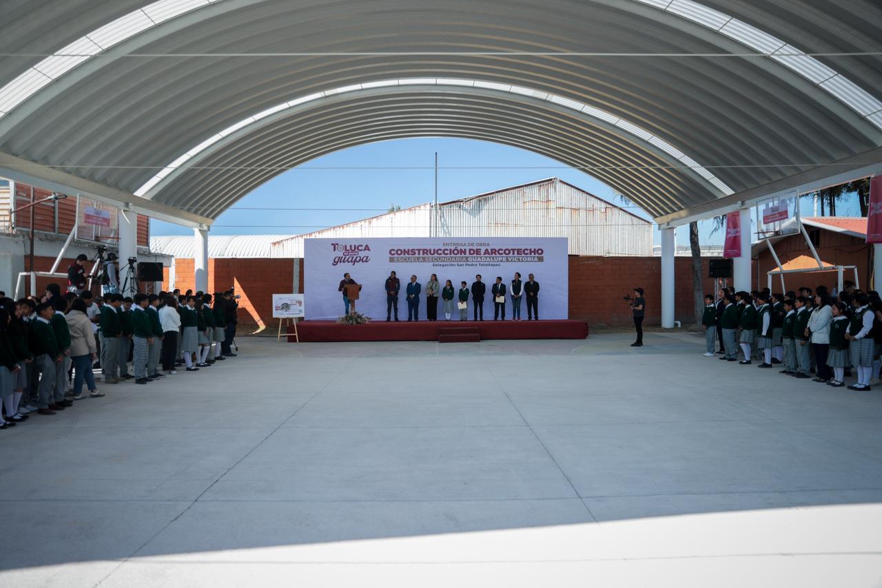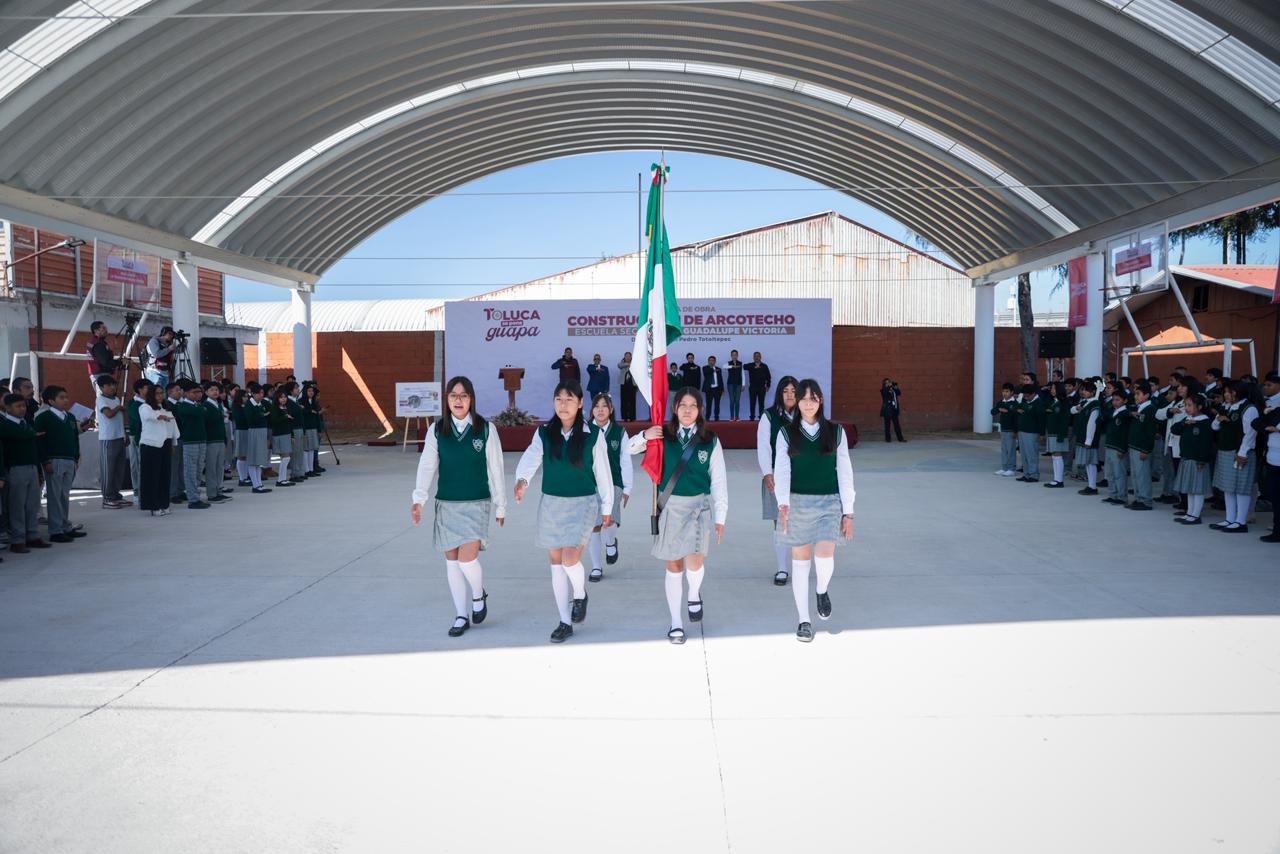 Toluca, Estado de México, 3 de febrero de 2026.- El alcalde Ricardo Moreno refrenda su apoyo decidido a la educación con la entrega del arcotecho en la Secundaria Guadalupe Victoria, en San Pedro Totoltepec, que dignifica la vida académica, fortalece la convivencia y favorece el desarrollo integral de las alumnas y alumnos, al permitirles realizar actividades cívicas, formativas, culturales y deportivas en condiciones adecuadas y seguras.
