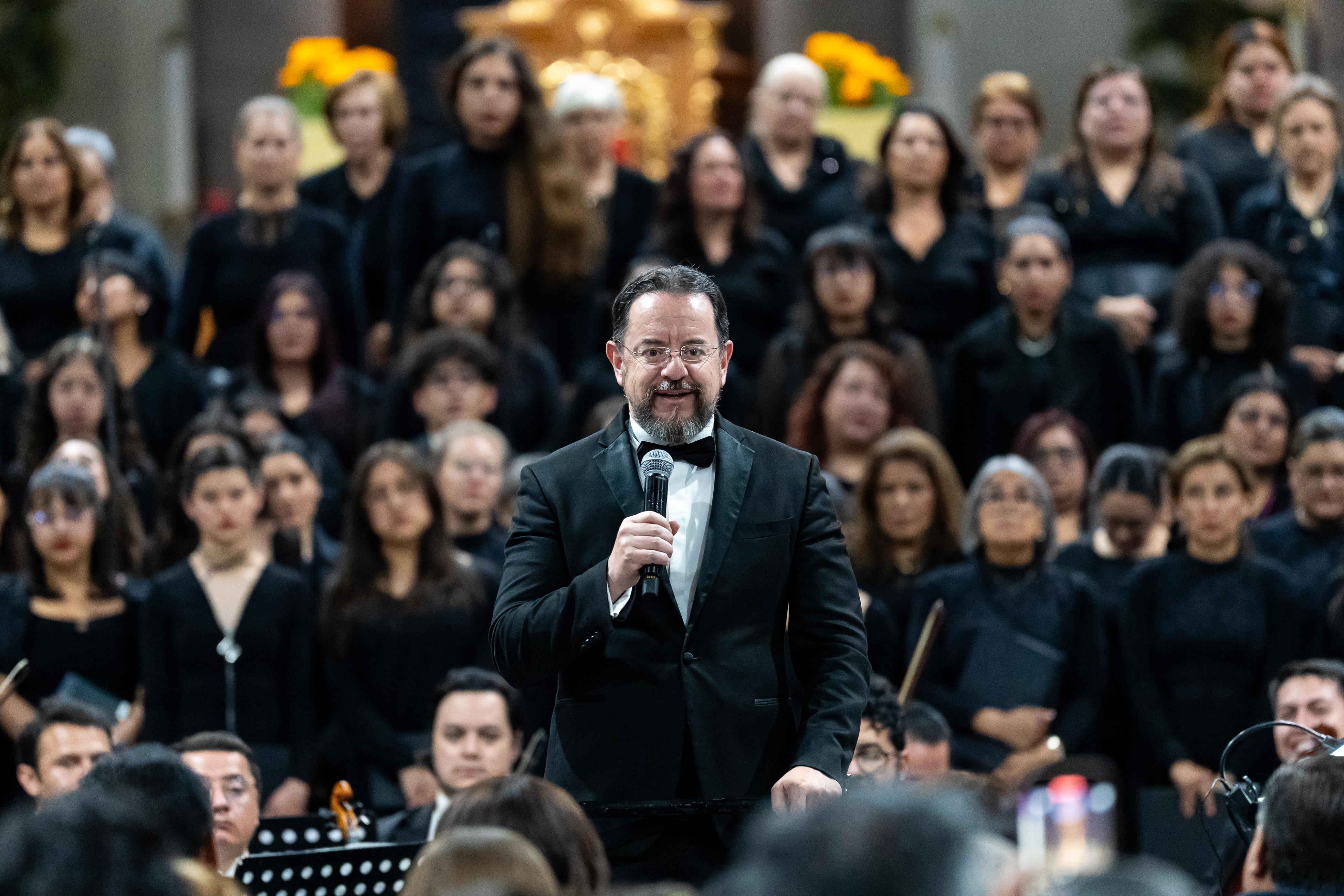 Toluca, Estado de México, 31 de octubre de 2025.- Con un lleno total en la Catedral, miles de personas disfrutaron de una velada única con el concierto In Memoriam que reunió a más de 230 artistas, entre músicos de la Orquesta Filarmónica de Toluca (OFiT) y talentosas voces que dieron vida a la obra Réquiem de Mozart.