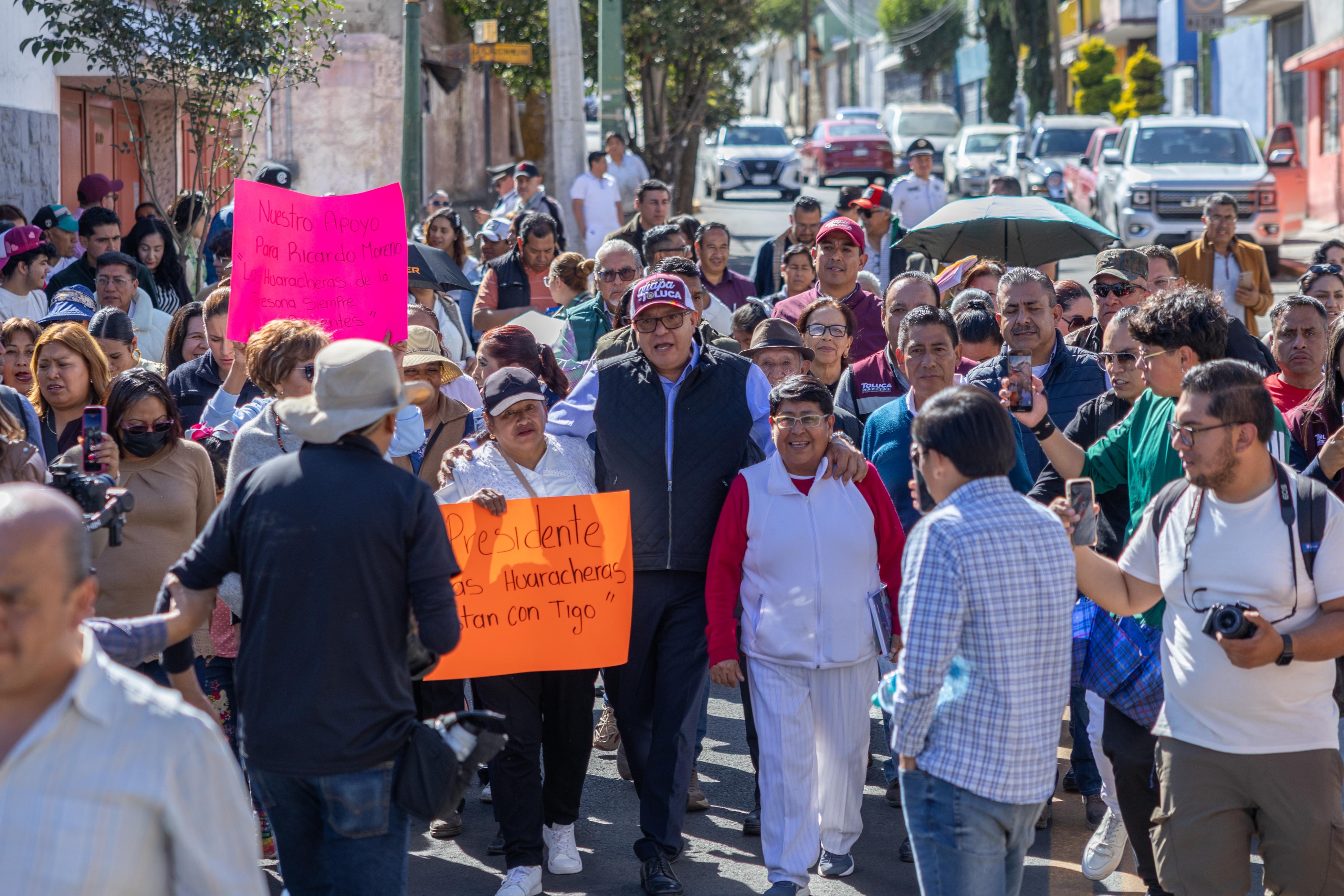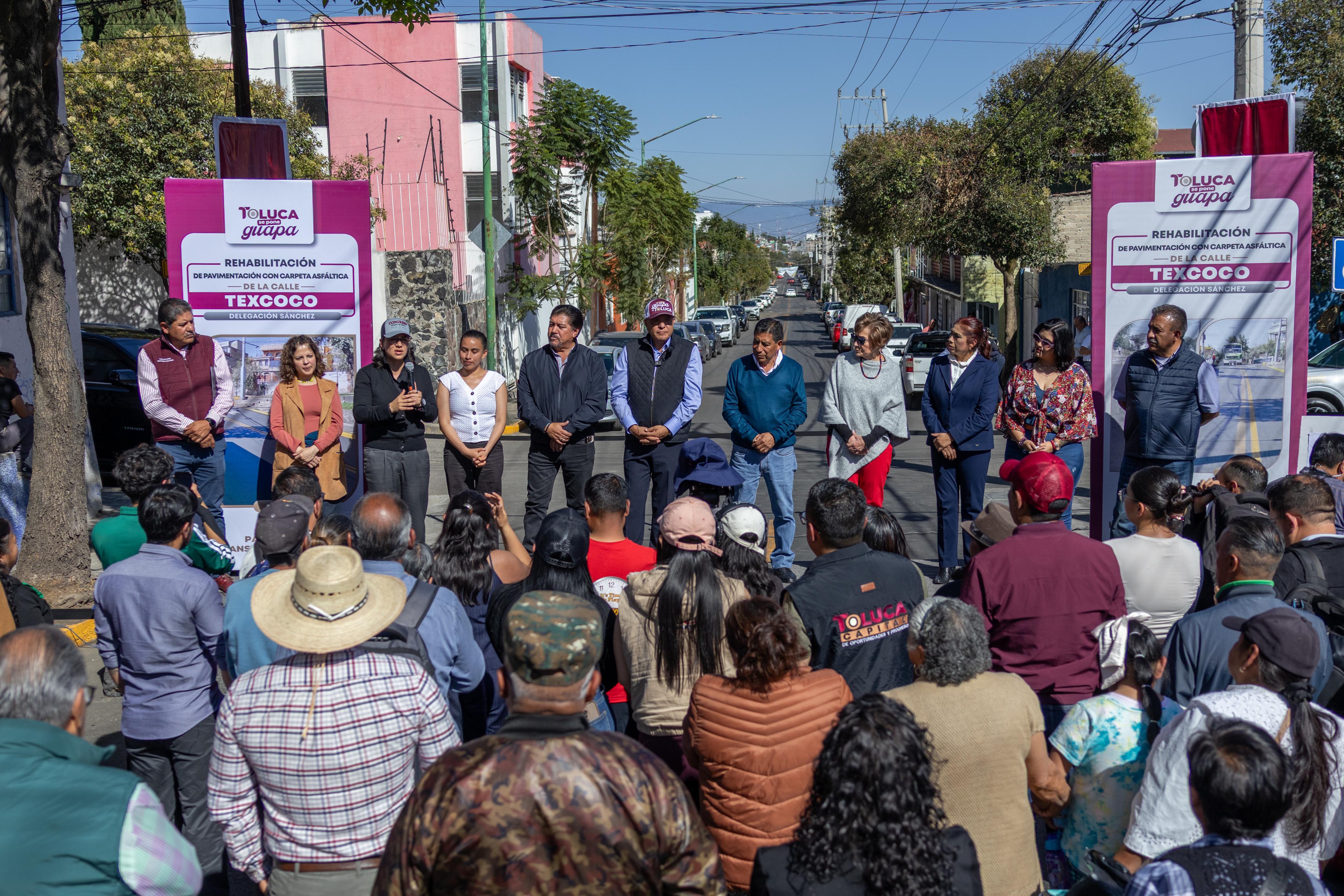 Toluca, Estado de México, 24 de febrero de 2026.- El alcalde Ricardo Moreno entregó la calle Texcoco en la delegación Sánchez, donde se llevó a cabo la rehabilitación de pavimento con carpeta asfáltica en beneficio de 12 mil personas, y con ello reafirma su compromiso de impulsar obras que favorezcan principalmente a niñas, mujeres y adultas mayores.