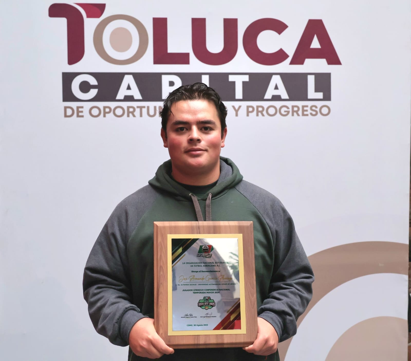 Entre las personas reconocidas se encuentra el caso del jugador de Potros Salvajes de la UAEMéx, José Armando García Arriaga, designado mejor jugador ofensivo de la Conferencia Nacional de la ONEFA.