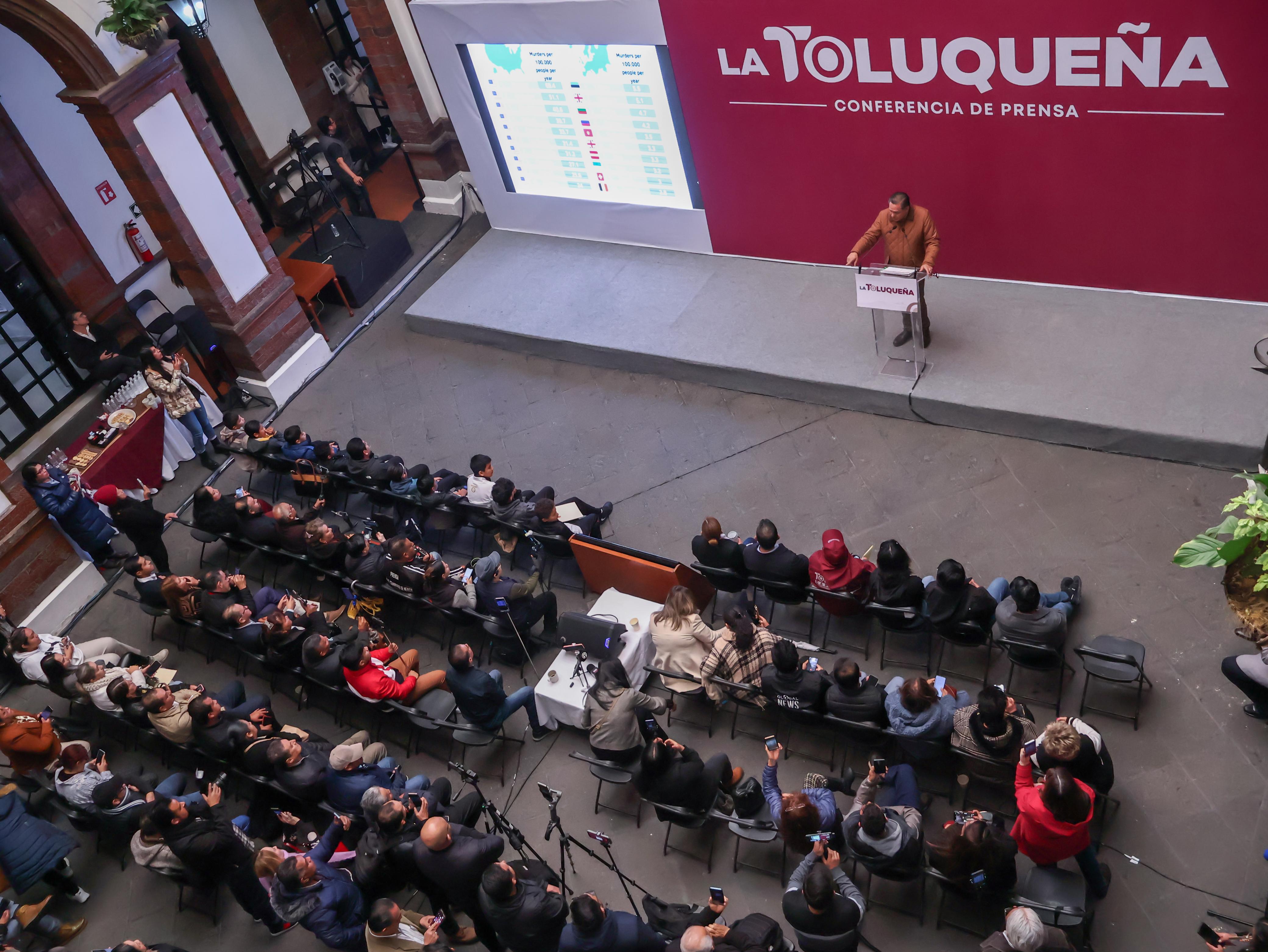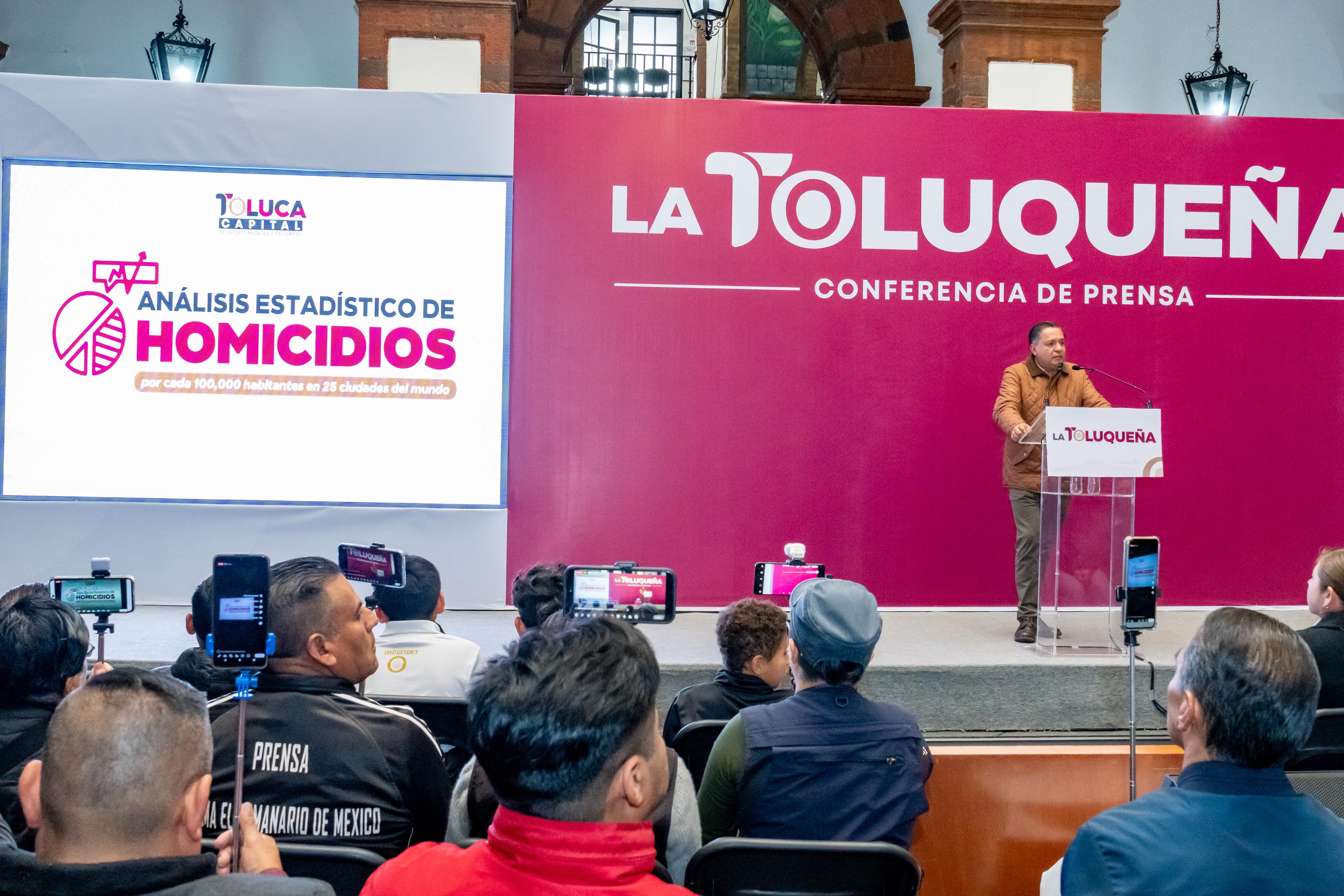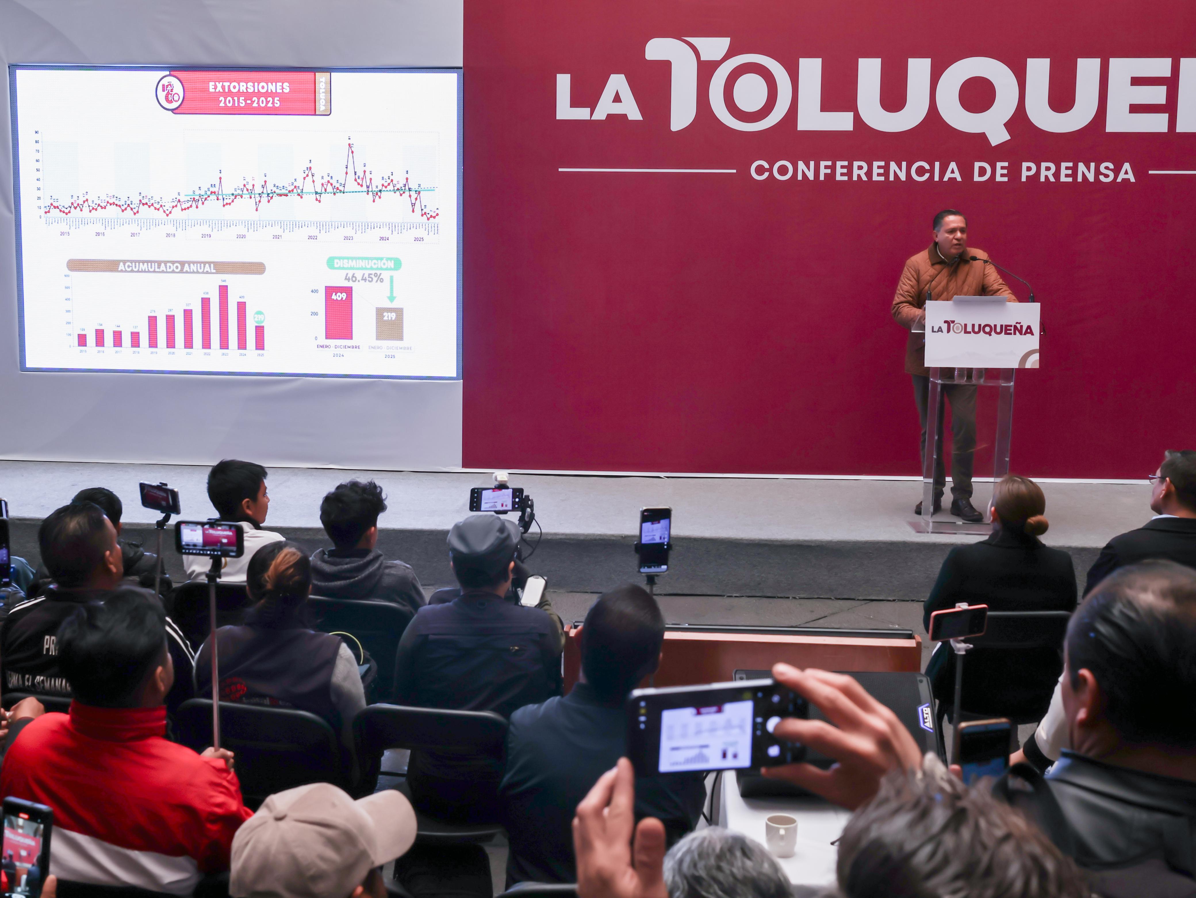 Durante la conferencia La Toluqueña, el alcalde detalló que el homicidio doloso cerró con 27 casos, logrando una reducción del 35.71%, mientras que el secuestro descendió un 43% con solo cuatro incidentes reportados. Moreno Bastida subrayó que, tras 13 meses consecutivos a la baja, el robo de vehículos mostró una de las caídas más significativas del país con un 56.09% menos, seguido por la extorsión, que disminuyó un 46.45%.