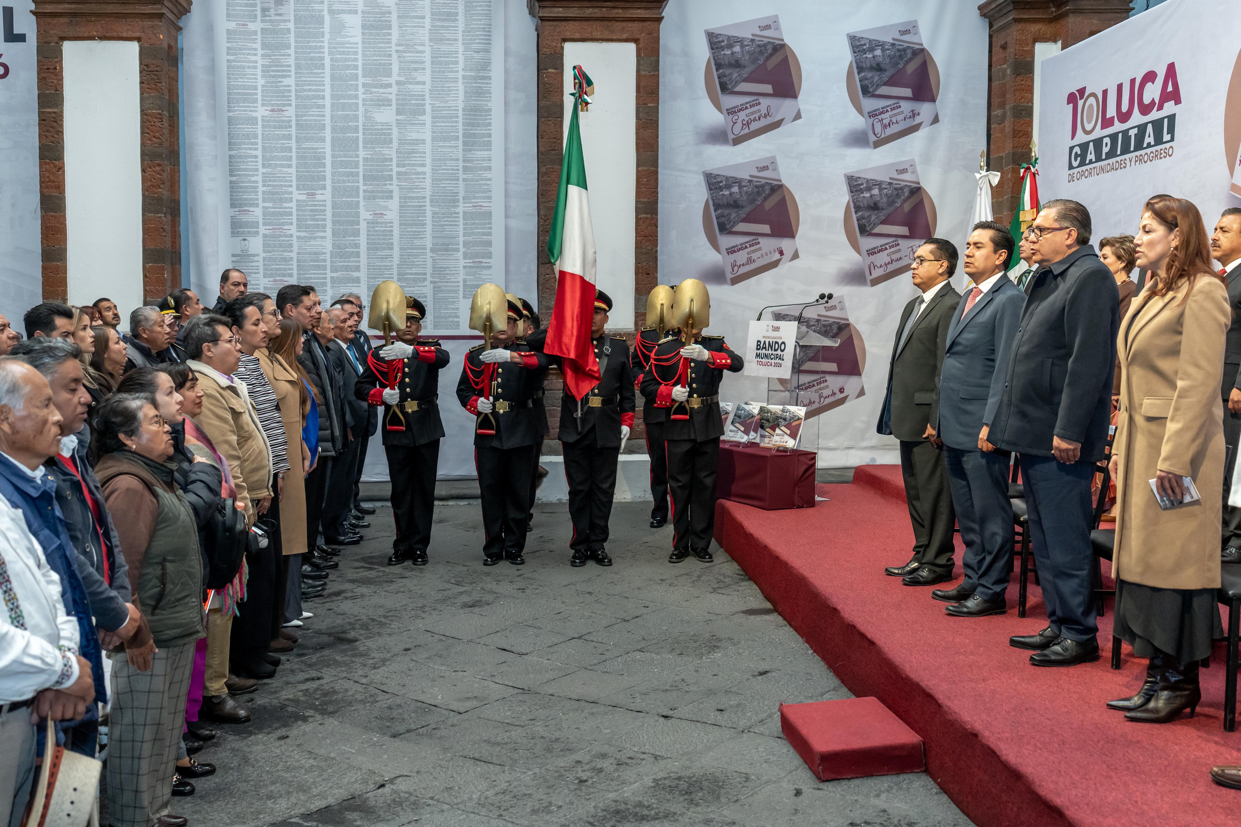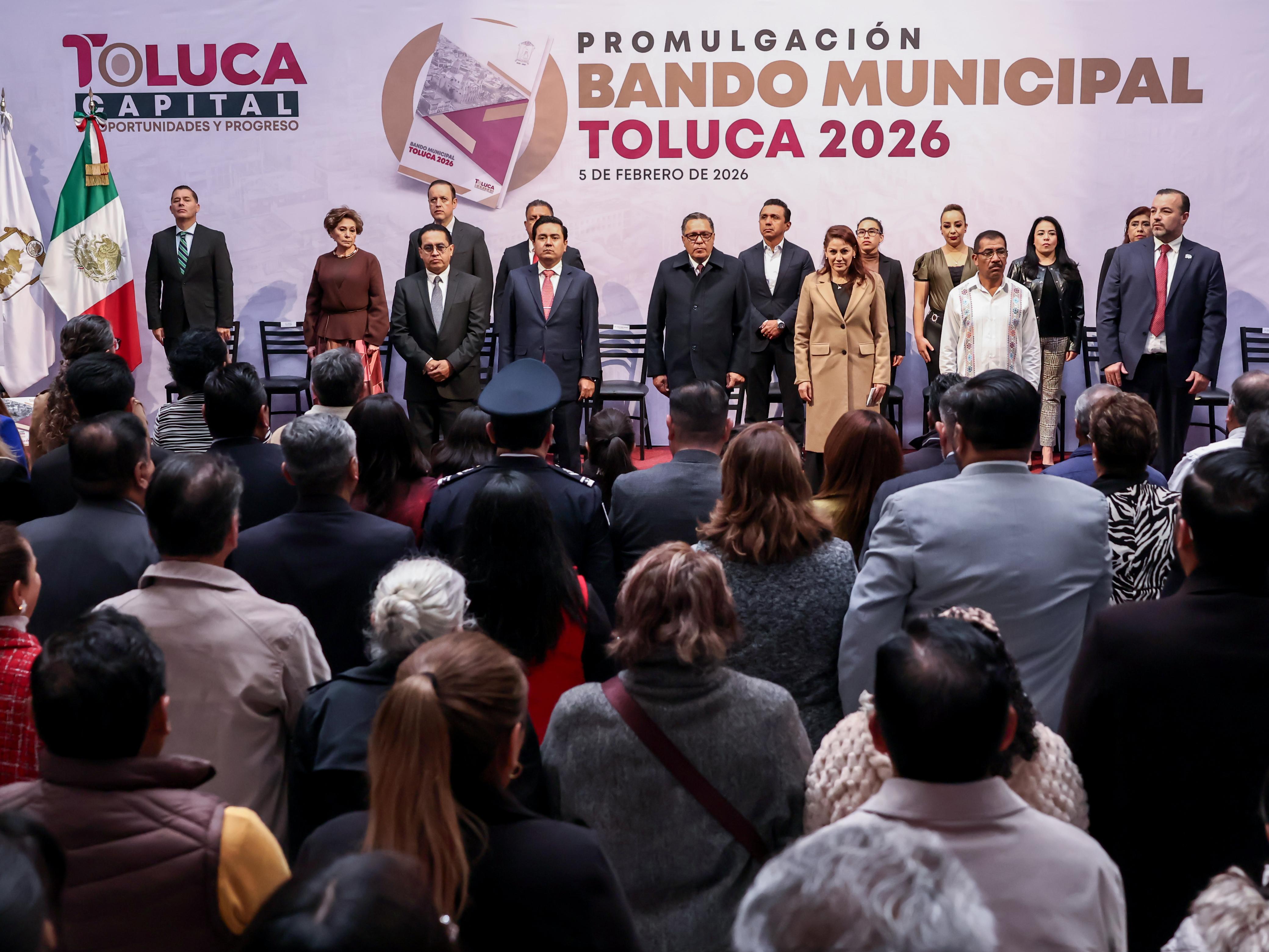Toluca, Estado de México, 5 de febrero de 2026.- El alcalde Ricardo Moreno definió el Bando Municipal 2026 como un instrumento de acción que materializa la visión de un gobierno enfocado en escuchar, atender y resolver las demandas de la población, además se erige como referente nacional de inclusión a través de cinco versiones: español, otomí, mazahua, braille y audiobando.