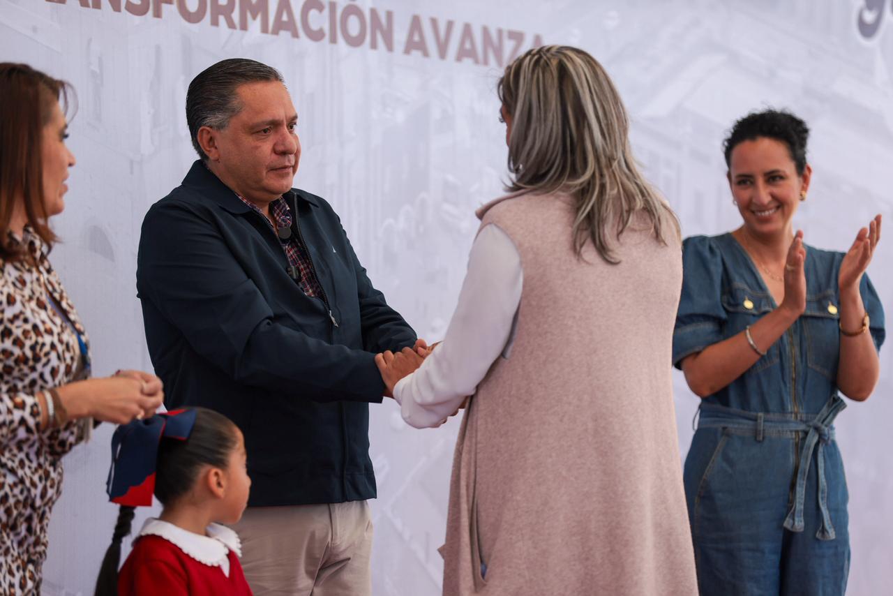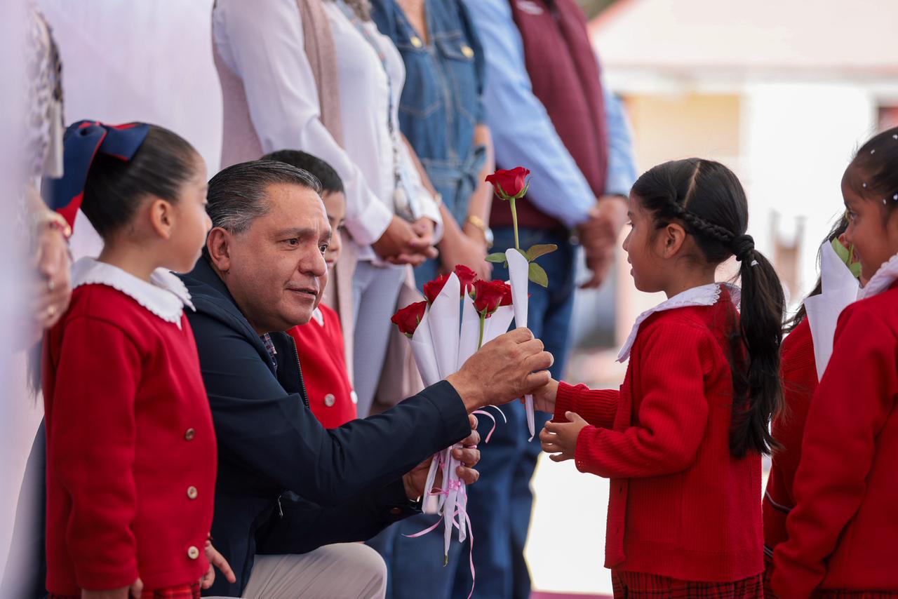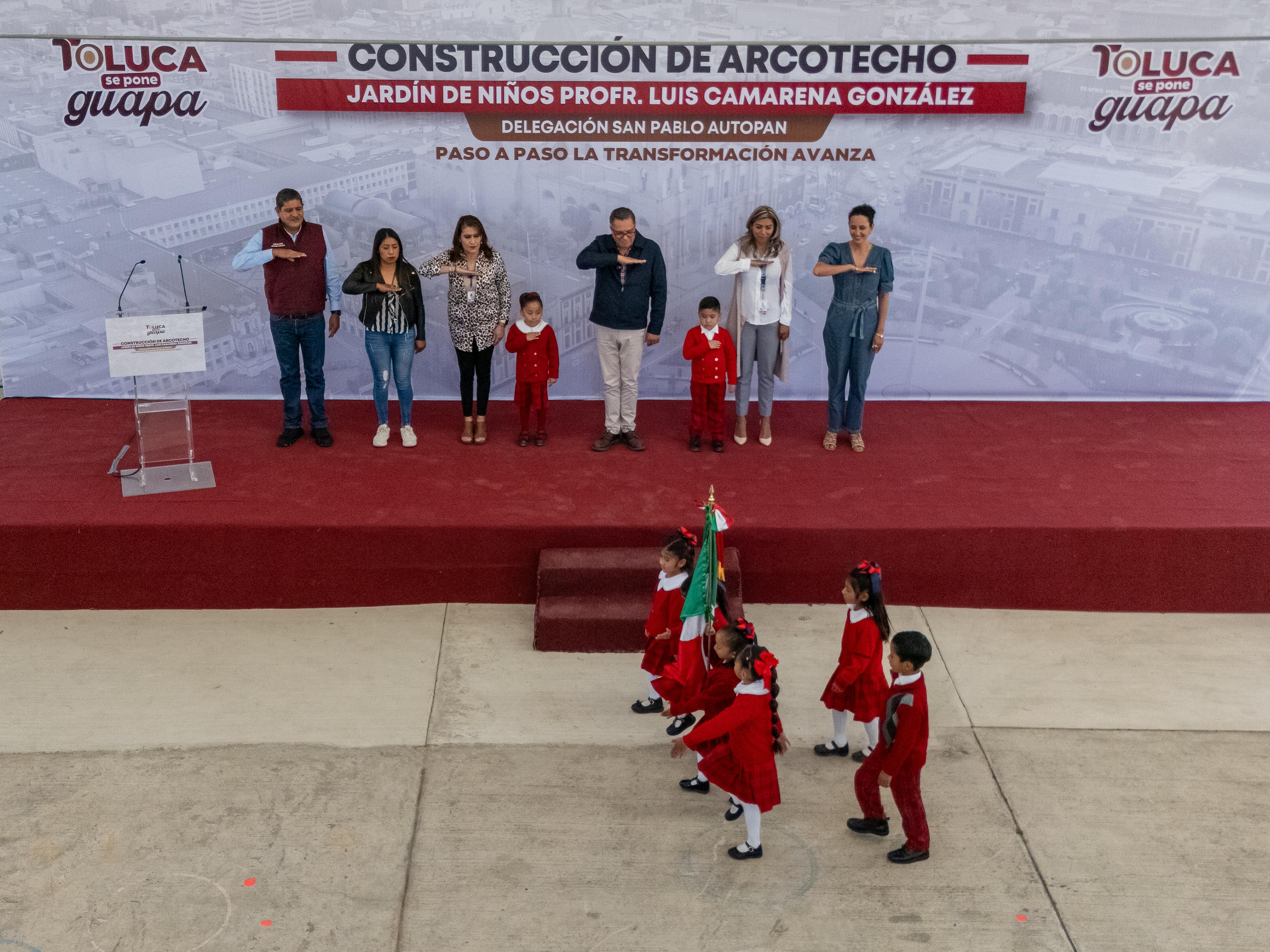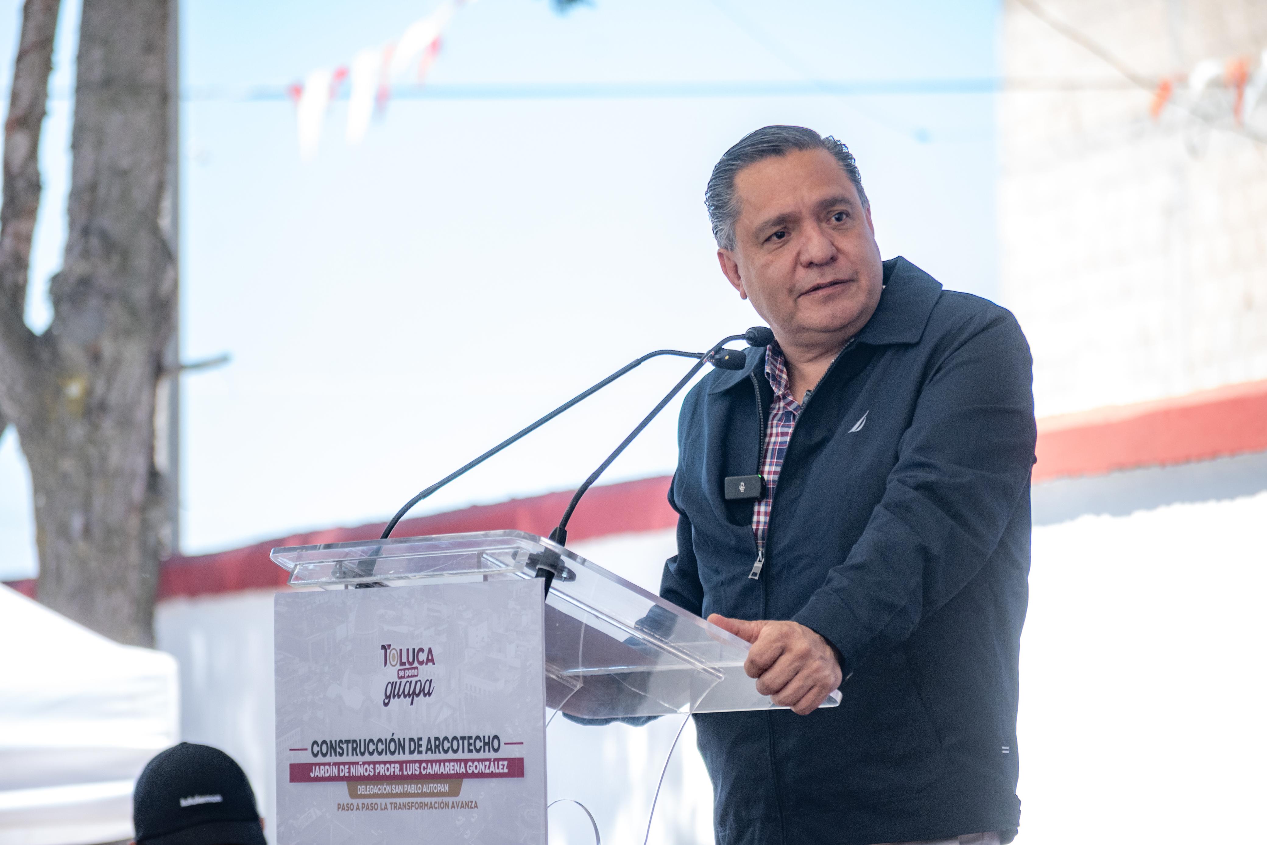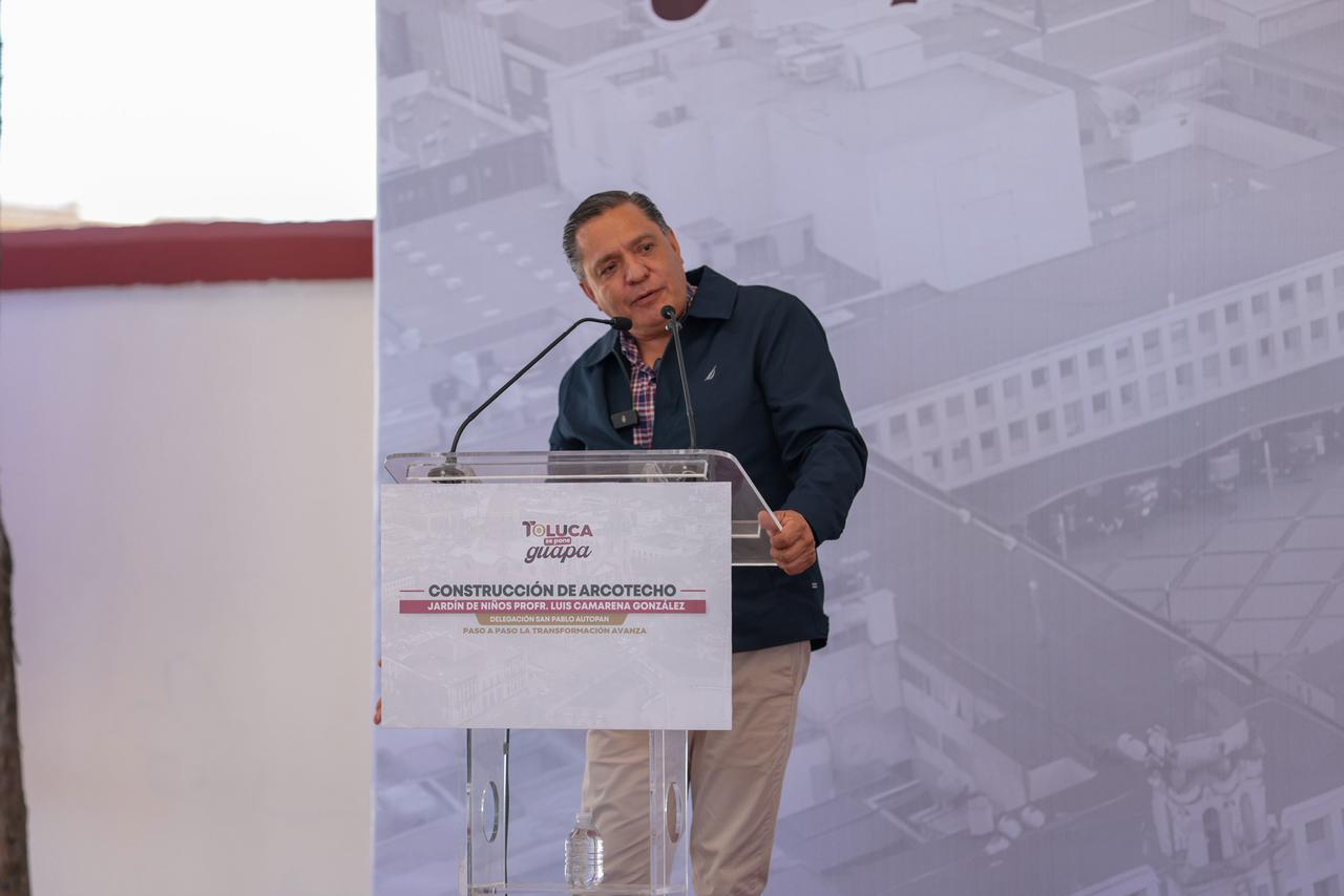 Toluca, Estado de México, 19 de febrero de 2026.- En beneficio de decenas de niñas y niños de San Pablo Autopan, el alcalde Ricardo Moreno entregó la construcción del arcotecho del Jardín de Niños Profesor Luis Camarena González.