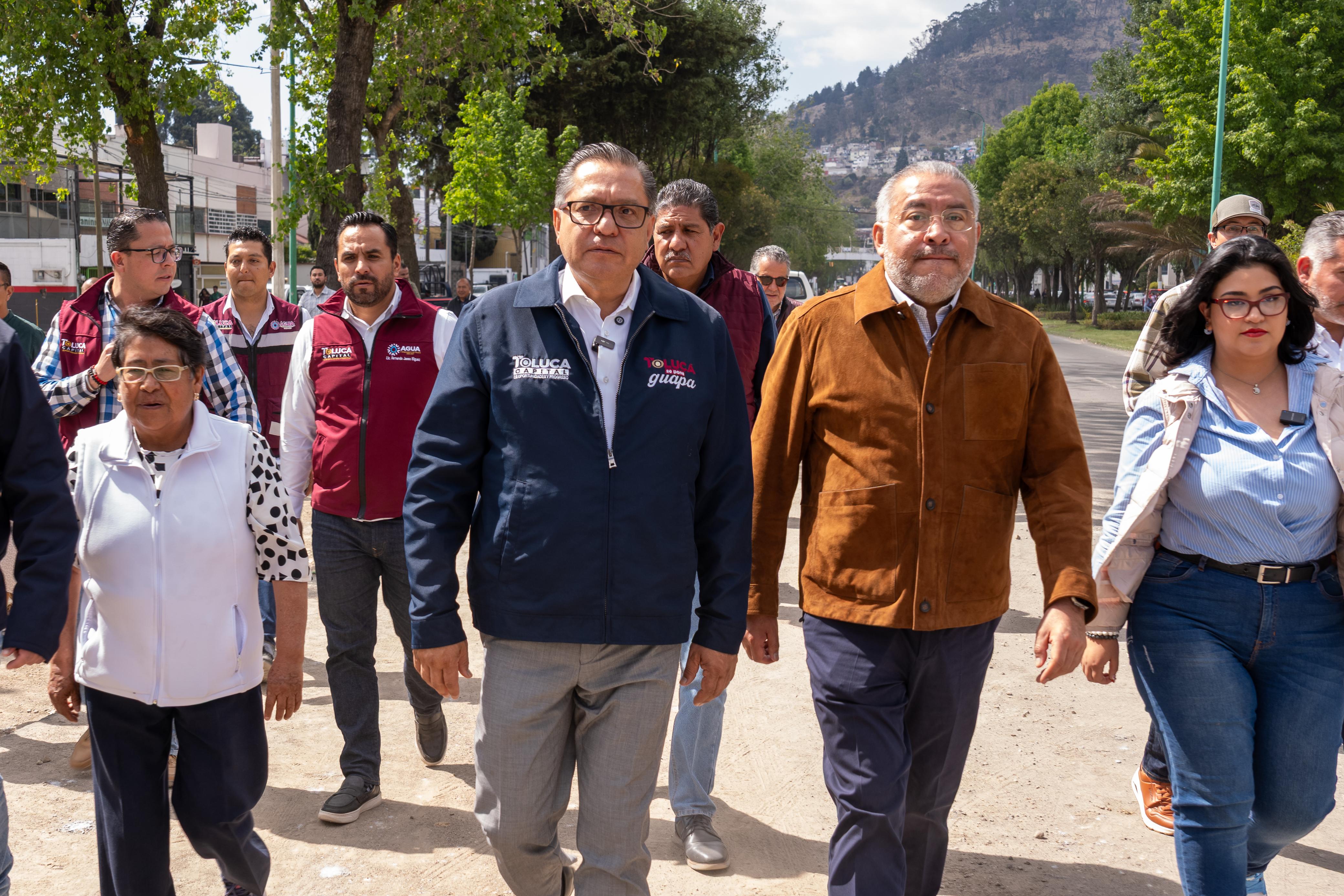 Toluca, Estado de México, 9 de abril de 2026.- Para mitigar inundaciones y encharcamientos que históricamente afectan a la zona poniente de la capital mexiquense, el alcalde Ricardo Moreno y el secretario general del gobierno del Estado de México, Horacio Duarte, supervisaron el avance de la construcción del nuevo Colector Pluvial sobre la Avenida Vicente Guerrero.